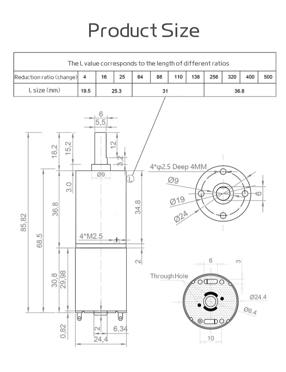 - Eixo de saída: Ø6 mm (comprimento 18,2 mm)