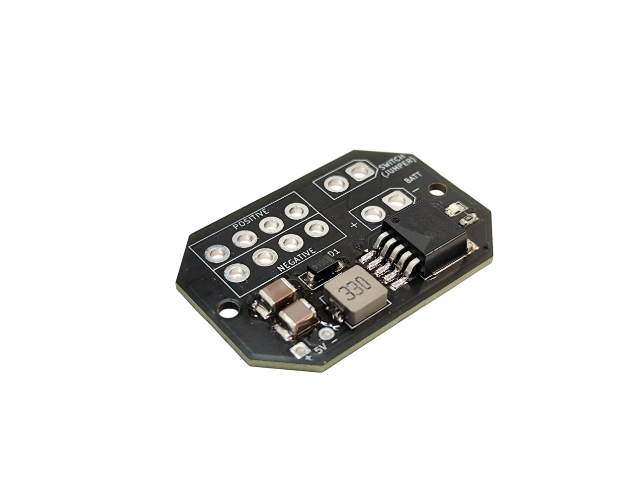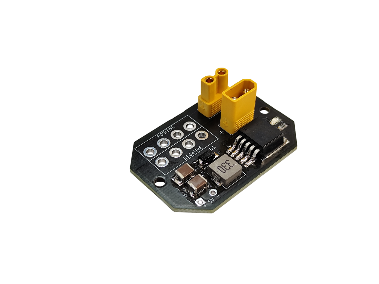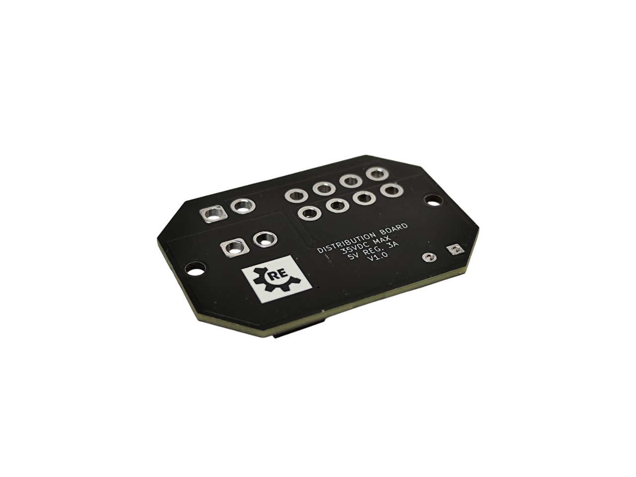 Além das 4 saídas de distribuição e do LED indicador de estado, esta versão inclui um regulador DC/DC integrado, capaz de fornecer 5 V até 3 A diretamente da mesma alimentação, evitando o uso de módulos externos.